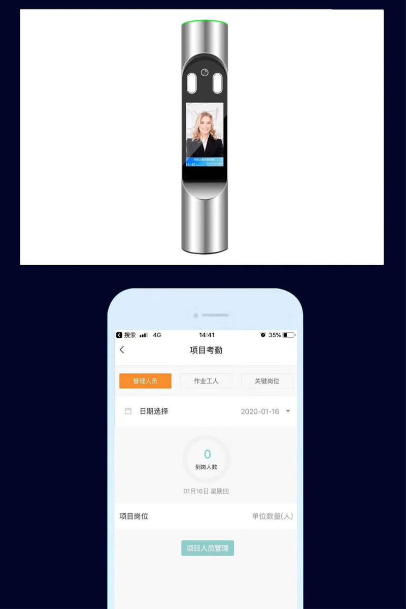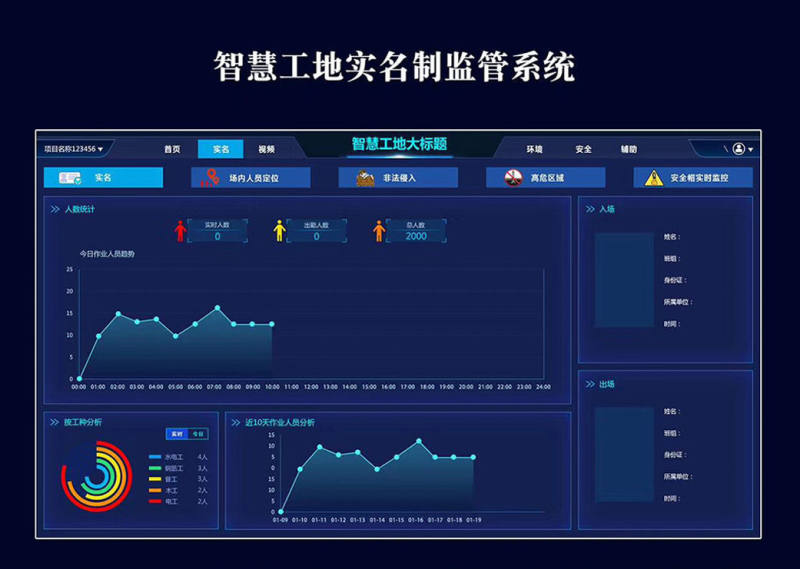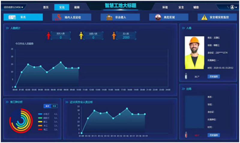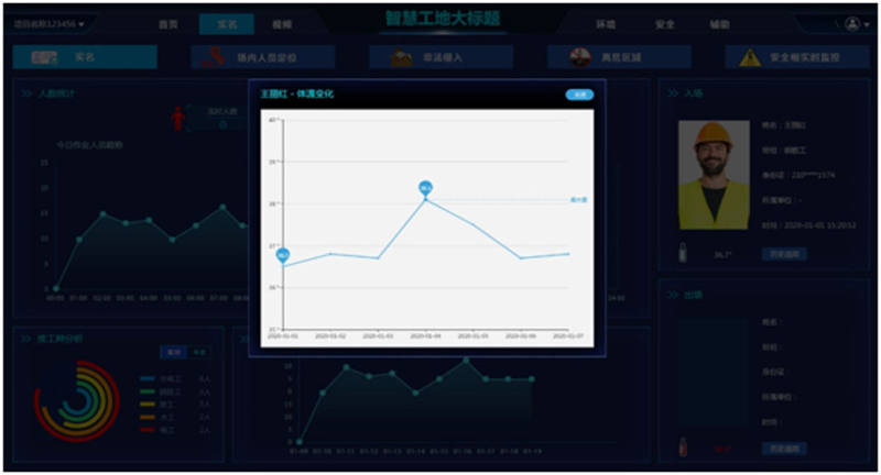 工地人员实名制管理系统,从企业管理端,工地端和手机APP端全方位地解决施工现场中出现的工人出勤天数不清、出勤人数不清、工资发放纠纷、施工现场情况无法实时掌控等问题。系统同时具有监测工作人员体温的功能,体温超出设定值后,现场语音报警,同时数据上传后台,后台软件具有分析功能,统计工作人员近期上下班体温数值,以图表形式展现出来。