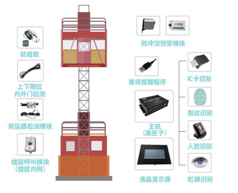 系统由主机、显示屏、重量传感器、高度速度传感器、门限位开关、层门检测开关、楼层呼叫器、电机功率检测模块、上限位开关等组成;